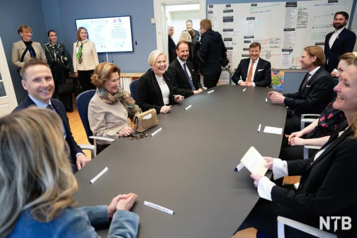 Islands president Halla Tómasdóttir, hennes ektemann Björn Skúlason, dronning Sonja og kronprins Haakon sammen med ordfører i Oslo Anne Lindboe og styreleder i Fontenehuset Hans Petter Høegh på besøk hos Fontenehuset under presidentparets offisielle statsbesøk til Norge