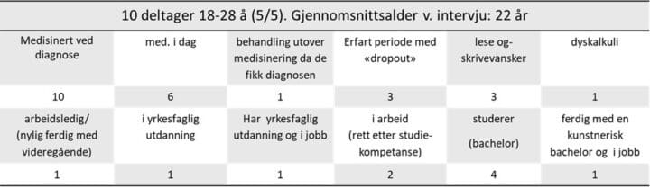 Utgangspunktet for denne artikkelen er tre studier som inngår i doktorgradsprosjektet «Hvordan er jeg meg? Om unge menneskers erfaringer av å leve med ADHD» (Grønneberg, 2025). Disse tar for seg 1) erfaringer fra tiden før den formelle diagnosen, 2) erfaringer i en tidslinje med diagnosen og 3), positive aspekter ved diagnosen. De tre studiene er basert på ti individuelle intervjuer av unge voksne, like mange menn som kvinner (Grønneberg et al., 2023a, 2023b, 2024). Deltagerne er fra ulike steder i Sørøst-Norge og har alle til felles at de fikk ADHD-diagnosen som barn eller ungdom. Tabell 1viser noen flere karakteristika.